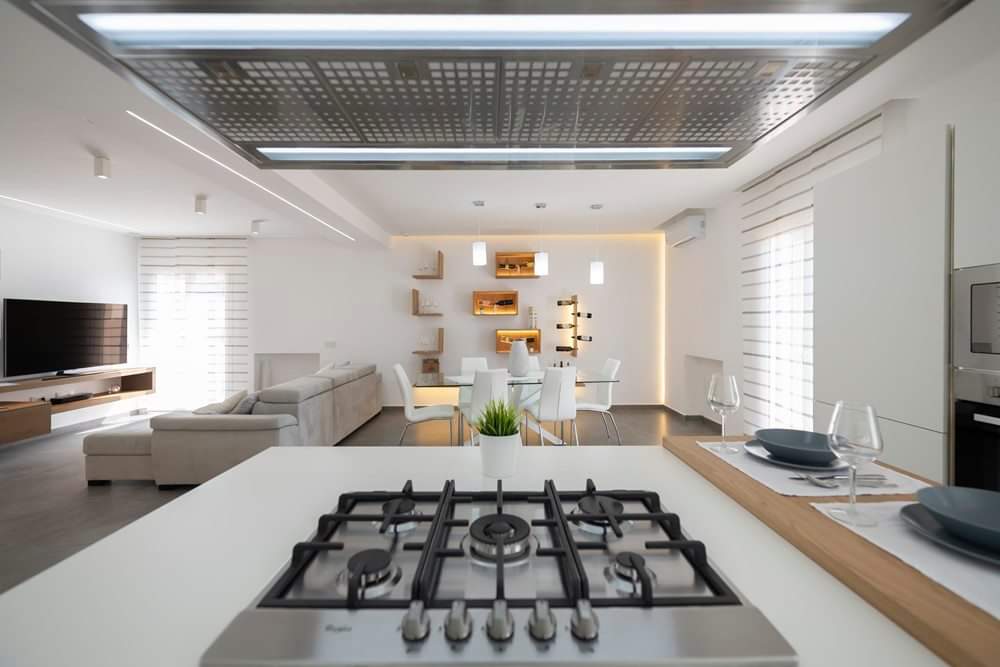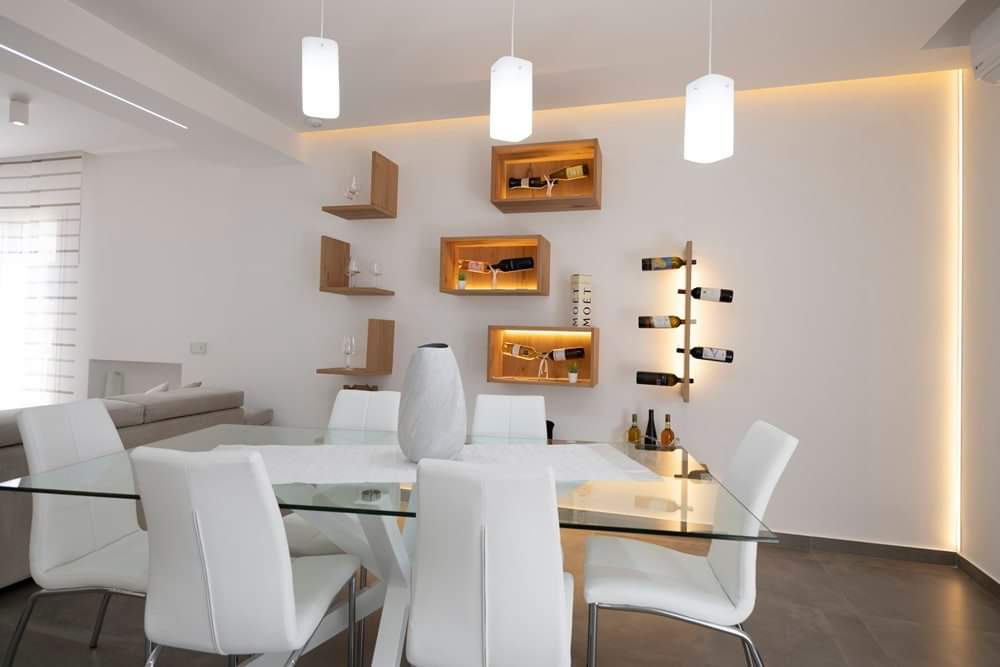 La cucina è a firma Veneta Cucine, con sgabelli e cantinetta vini.