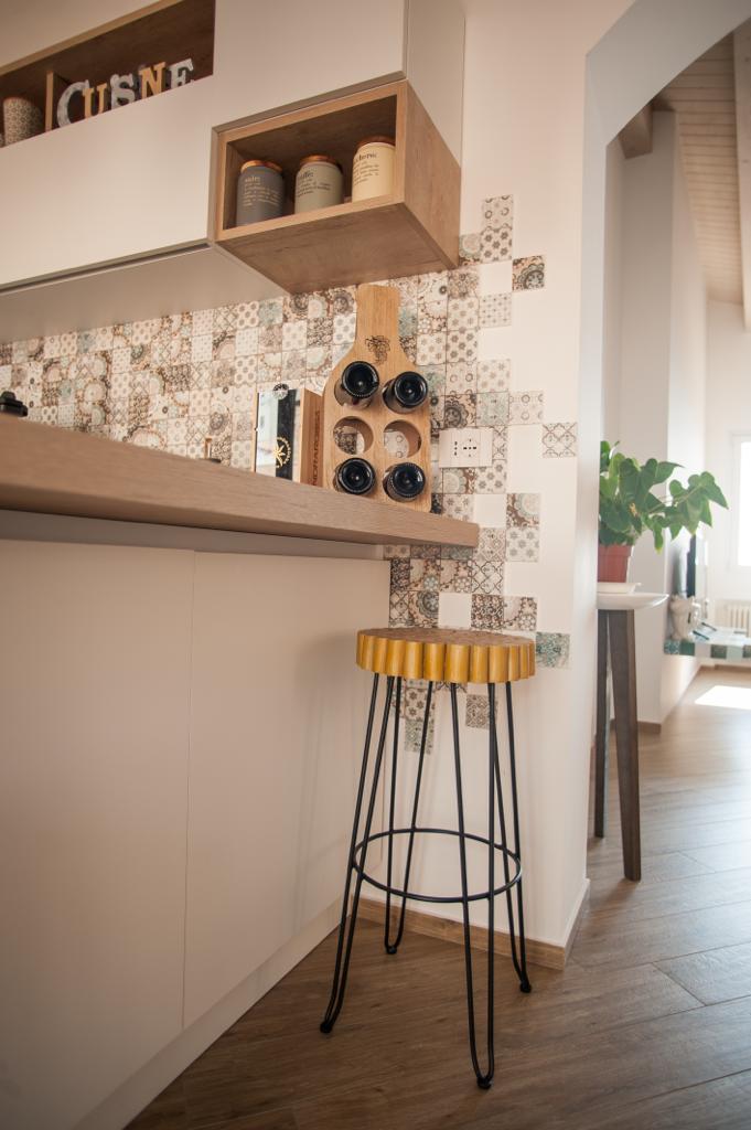 La zona living invece è arredata con il divano, tavoli e sedie Calligaris e porta tv Lago.