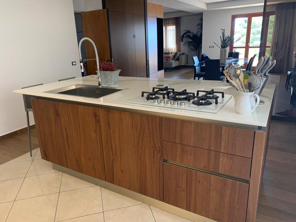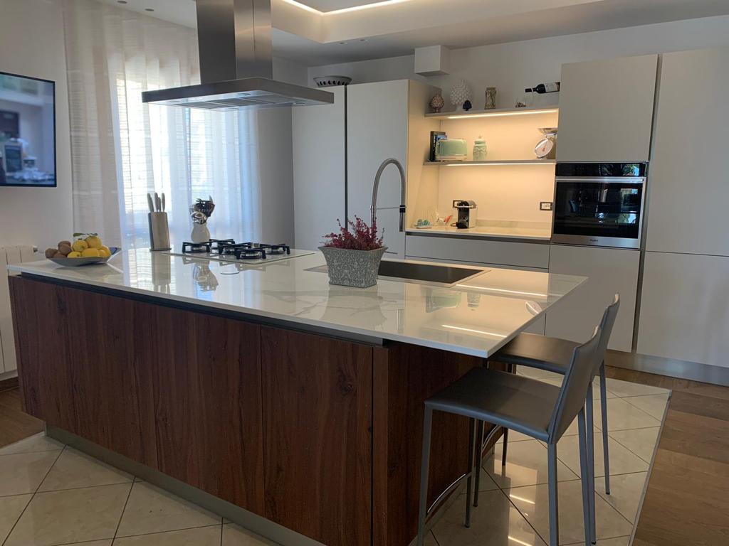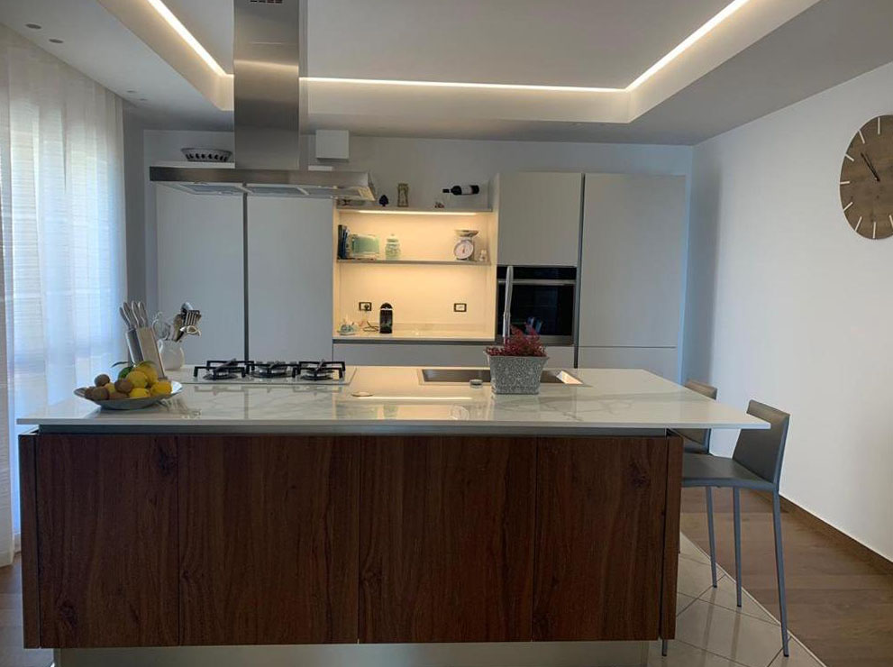 La cucina vede la firma Veneta Cucine e gli sgabelli Calligaris.