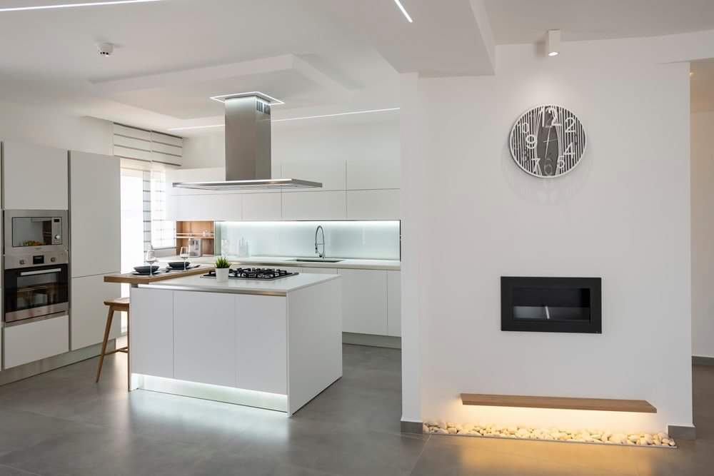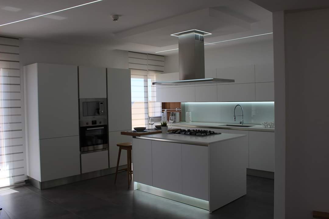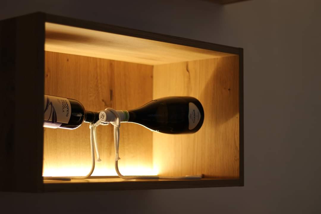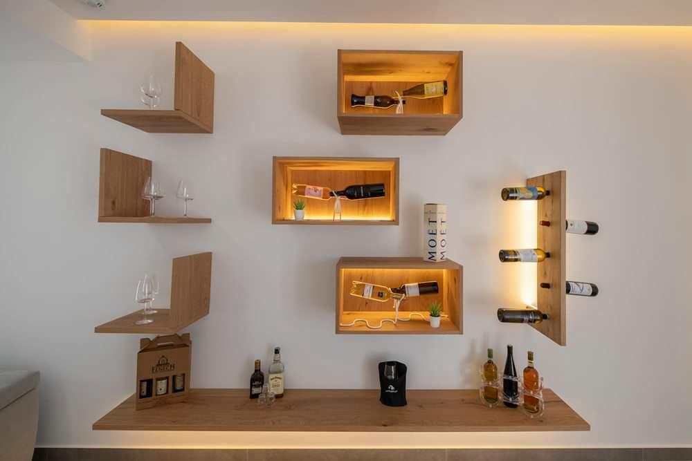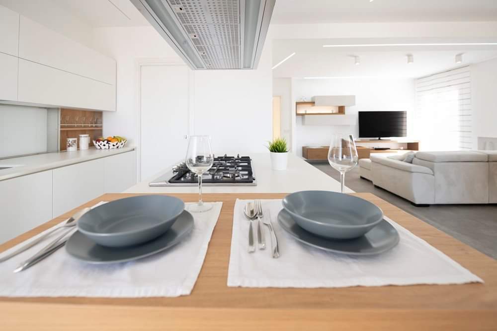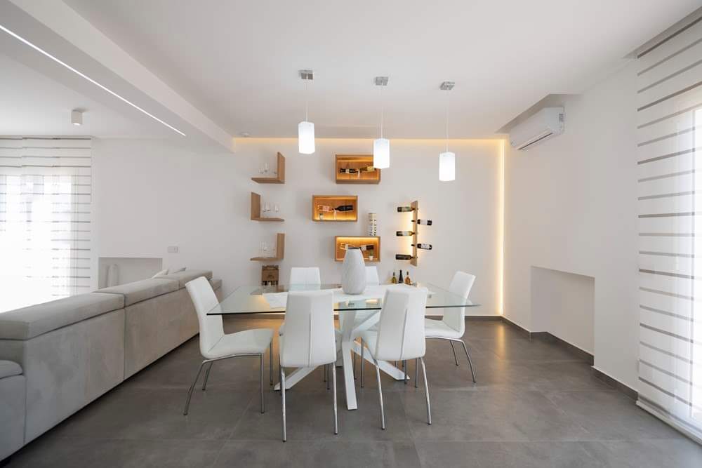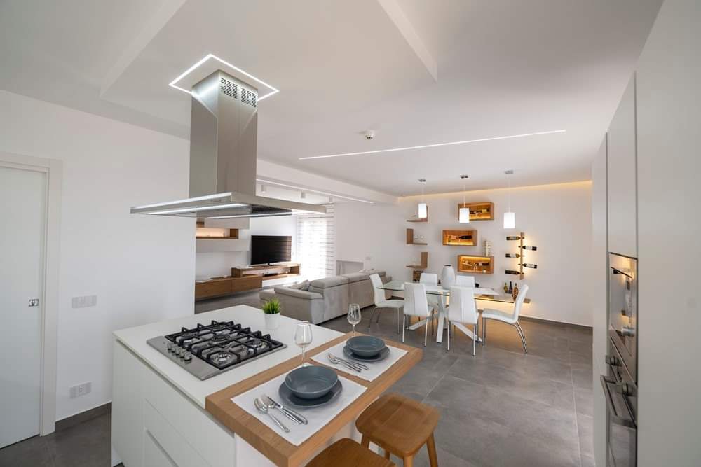 La cucina è a firma Veneta Cucine, con sgabelli e cantinetta vini.