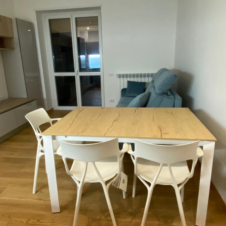 La zona living include la cucina e la parete di Veneta Cucine, la sedia Kartell, il tavolo Calligaris ed il divano-letto Materassi.